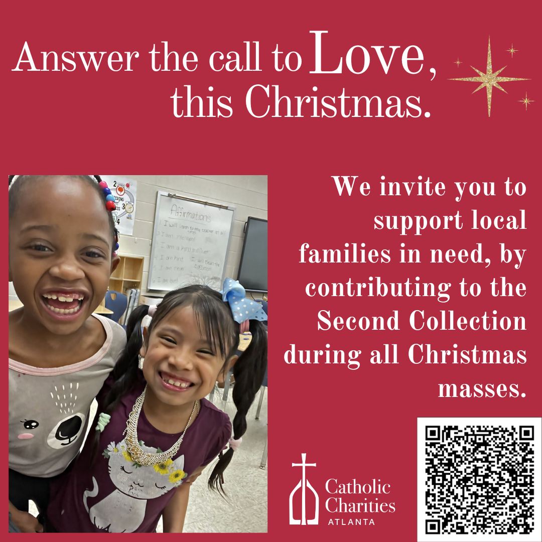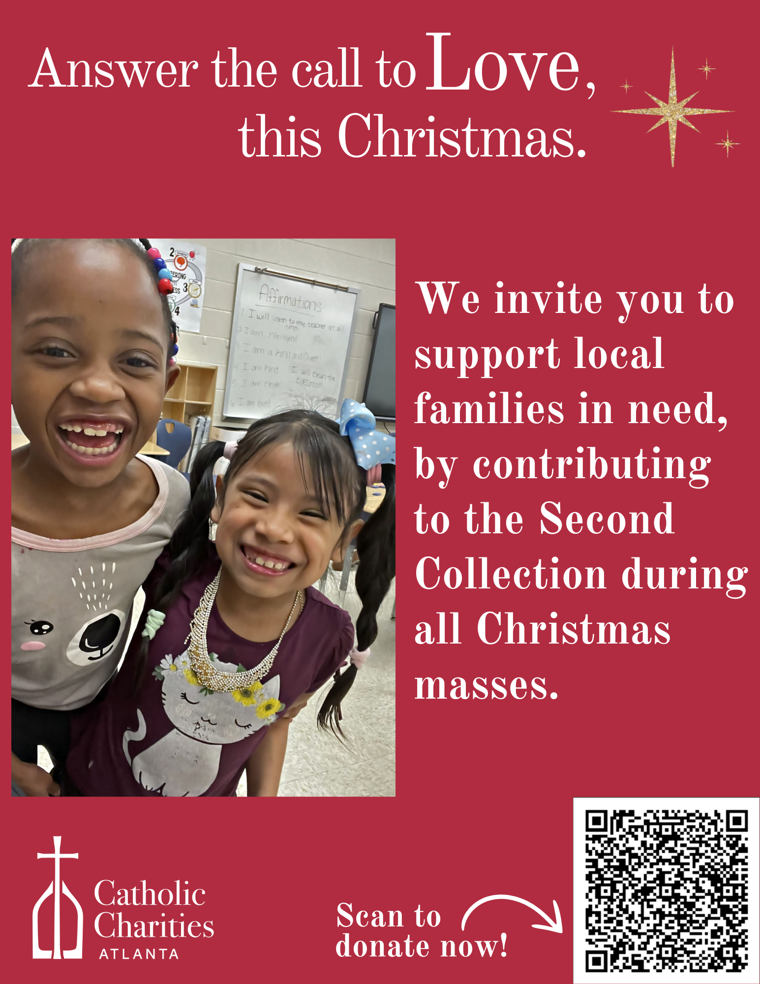 Bulletin/pulpit announcement for December 24-25 – The second collection this Christmas Eve and Christmas Day will benefit Catholic Charities Atlanta. Your gift will enable a family to finally break the cycle of poverty and become self-reliant. Last year, Catholic Charities served nearly 12,000 individuals. Please give generously so they can continue to extend love and the light of Jesus as they serve out neighbors in need.