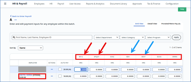 - The payroll batch type “Regular” has been updated so that the EOT code is moved farther to the right, next to the EH Holiday earning code. Please be careful when keying hours in your batch to ensure you are using the correct column/earning code.